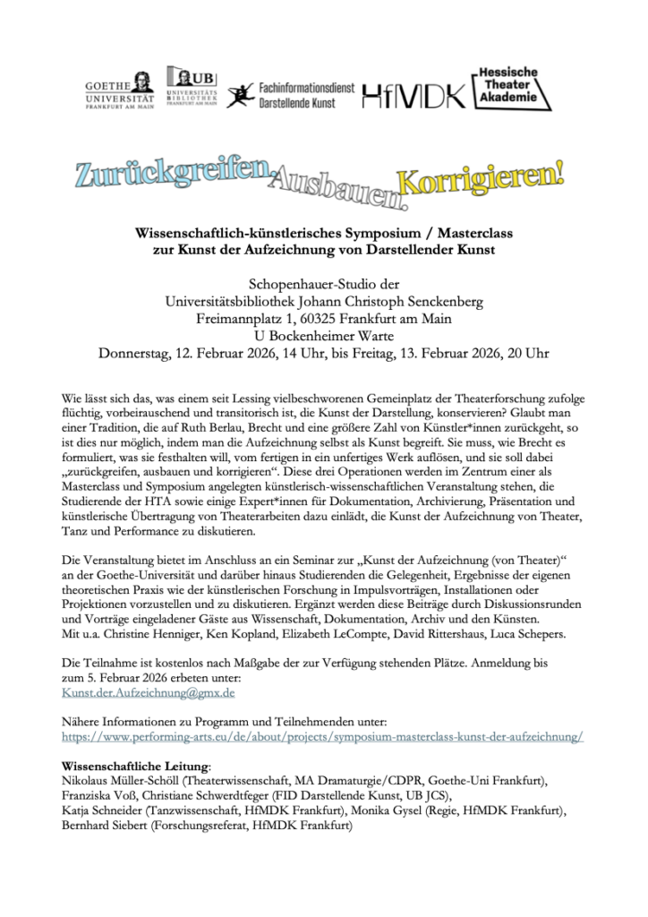 Zurückgreifen. Ausbauen. Korrigieren! Wissenschaftlich-künstlerisches Symposium / Masterclass zur Kunst der Aufzeichnung von Darstellender Kunst